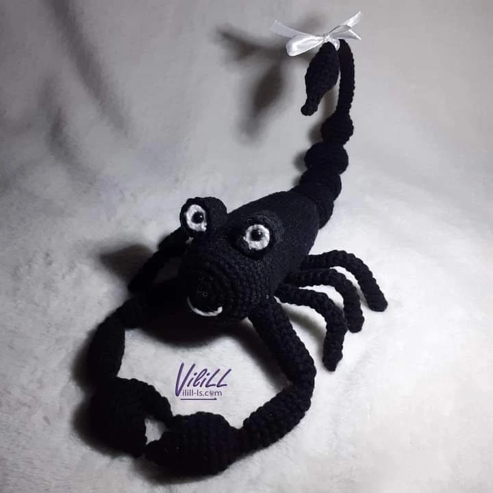 ,излязъл от ръцете ми преди години, беше спонтанна хрумка в пясъчен бежов цвят. Изцяло сътворен в типично мой стил- съчетание от опит, въображение, уловени с химикалката като записки в тетрадката. Като ме хвана музата, на мига запретнах ръкави, хванах куката и кълбенцето и се залових на работа. Любопитството от крайния резултат ме движеше и НЕ ми даваше мира. Разполагам само с 2 ръце и 2 очи, които НЕ могат да догонят фантазията. Във времето схемата ми претърпя неколкократни корекции до вида на черния пореден скорпион...и май няма да са последни. Всяко скорпионче, колкото и да си прилича с братята и сестрите си, е различно от тях.
